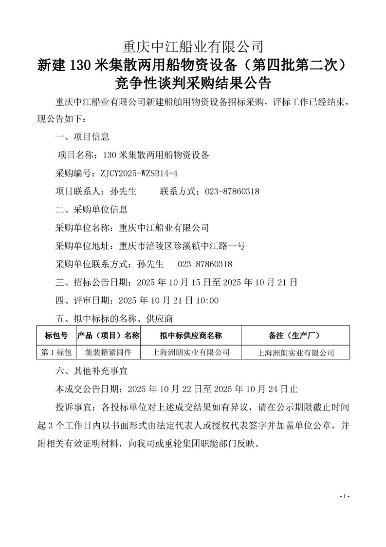 中江船業(yè)新建130米集散兩用船物資設(shè)備(第四批第二次)競爭性談判采購結(jié)果公告(采購編號:ZJCY2025-WZSB14-4)
